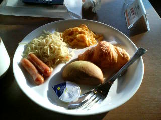 結局スクランブルエッグ少々、パスタ少々、クロワッサン4個食べ