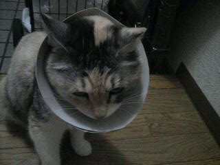 とりあえず傷口を消毒。舐めないようにエリザベスカラーを作ってみました